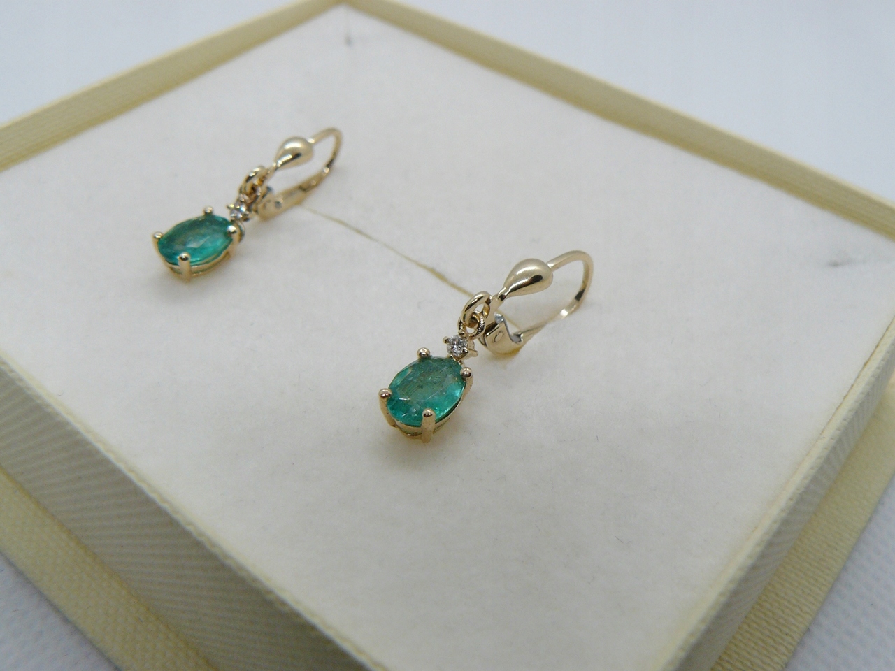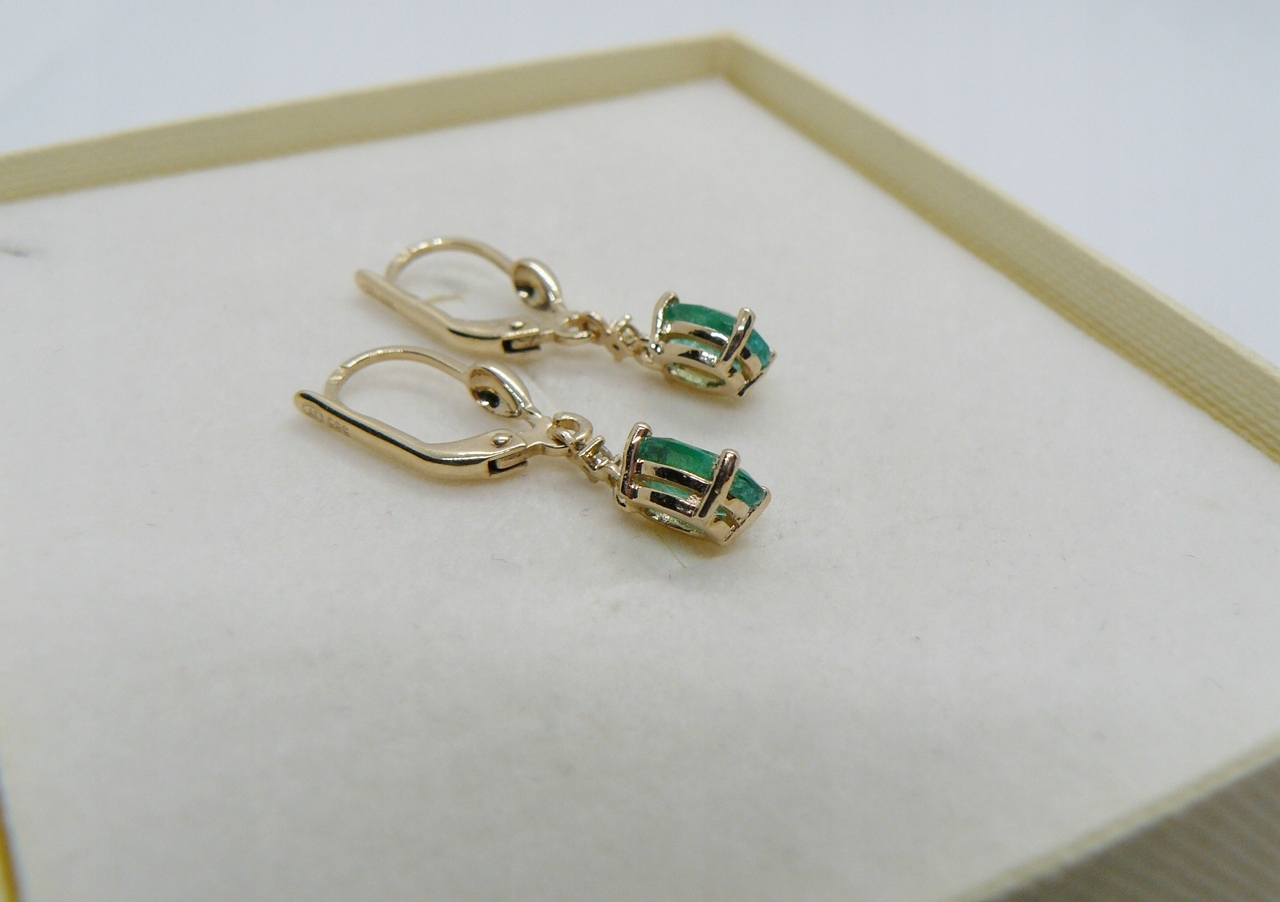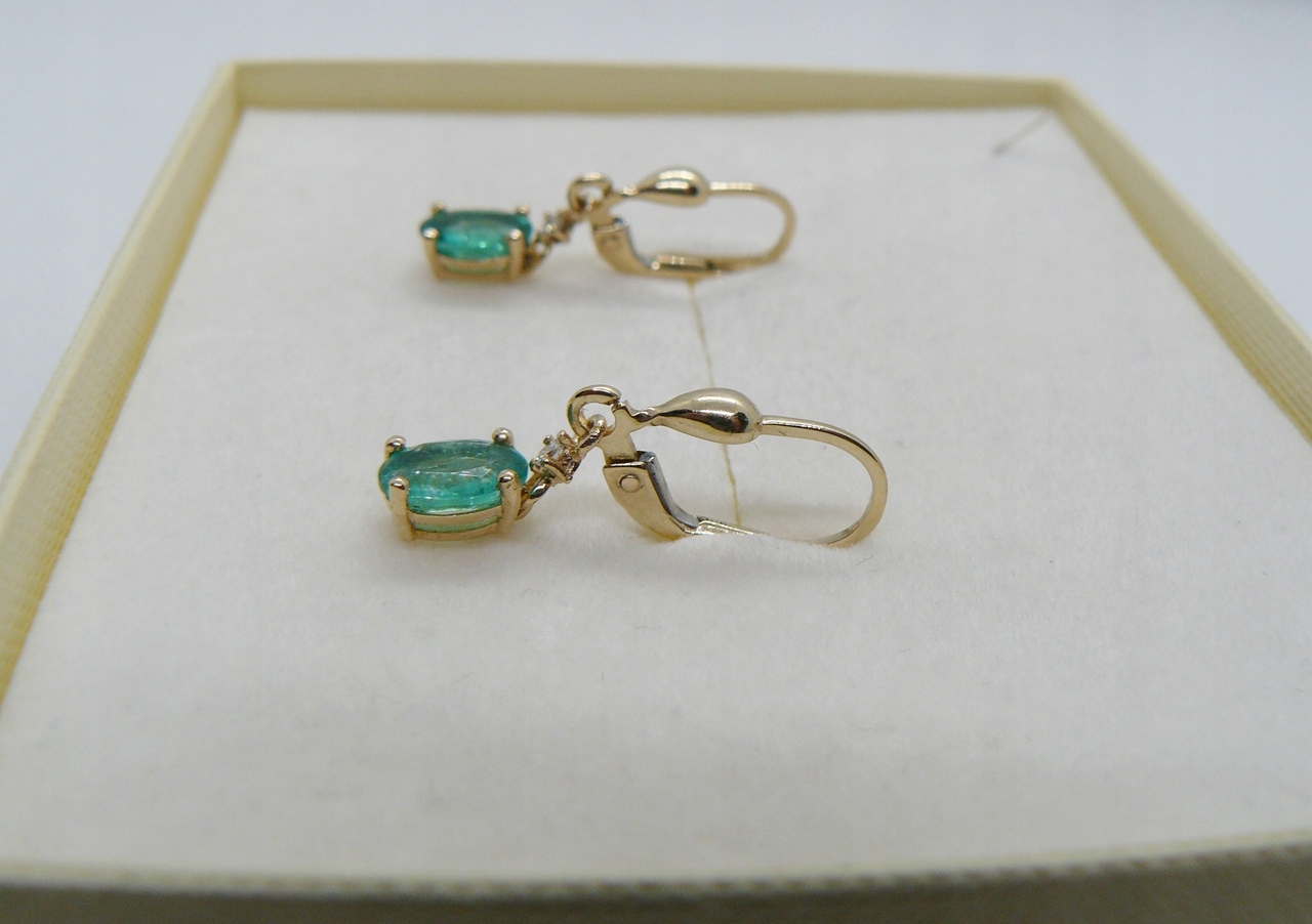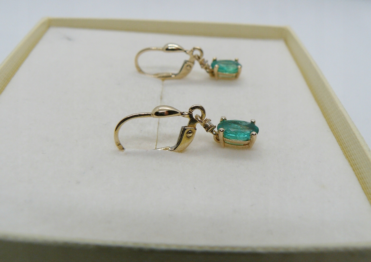 zestaw zawiera: złote kolczyki ze szmaragdami i diamentami, ozdobne pudełeczko, certyfikat jubilerski