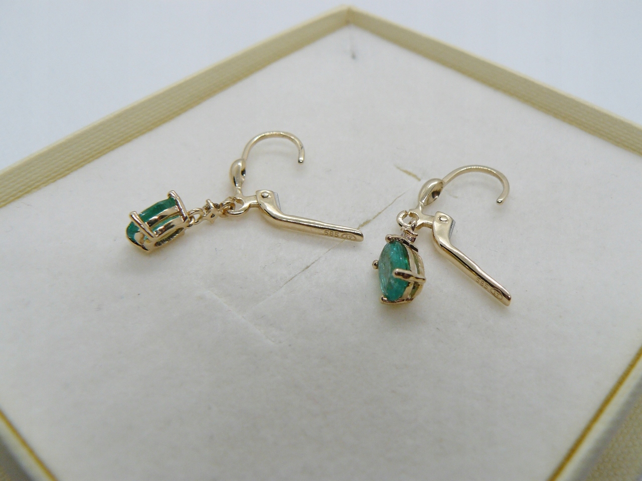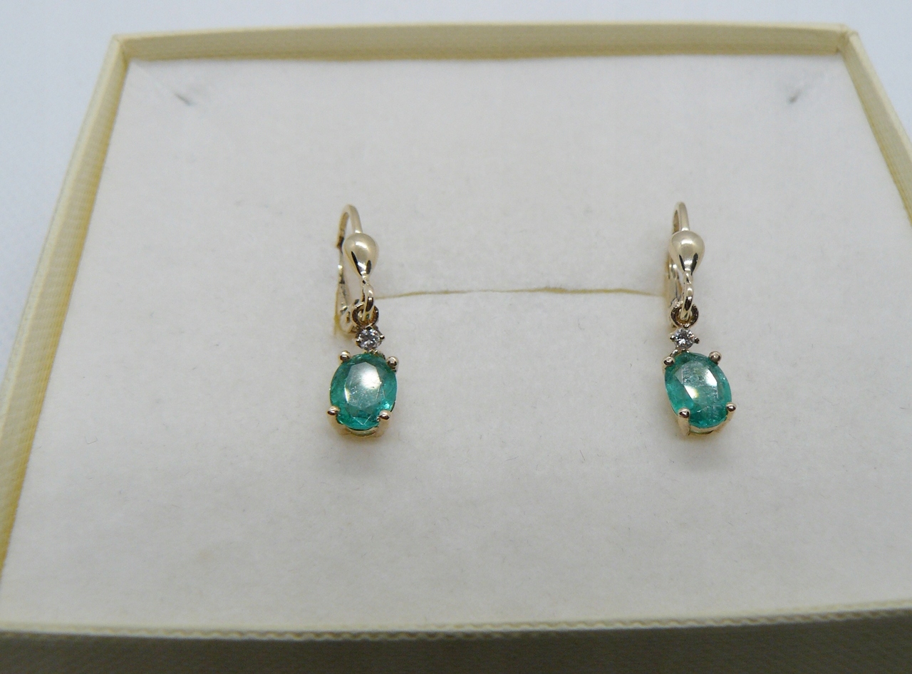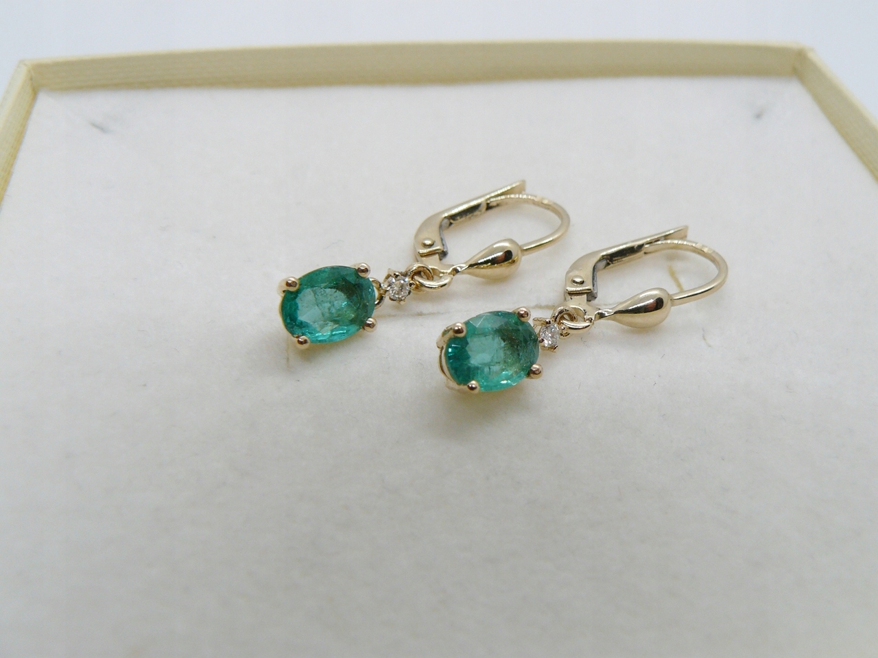 zestaw zawiera: złote kolczyki ze szmaragdami i diamentami, ozdobne pudełeczko, certyfikat jubilerski